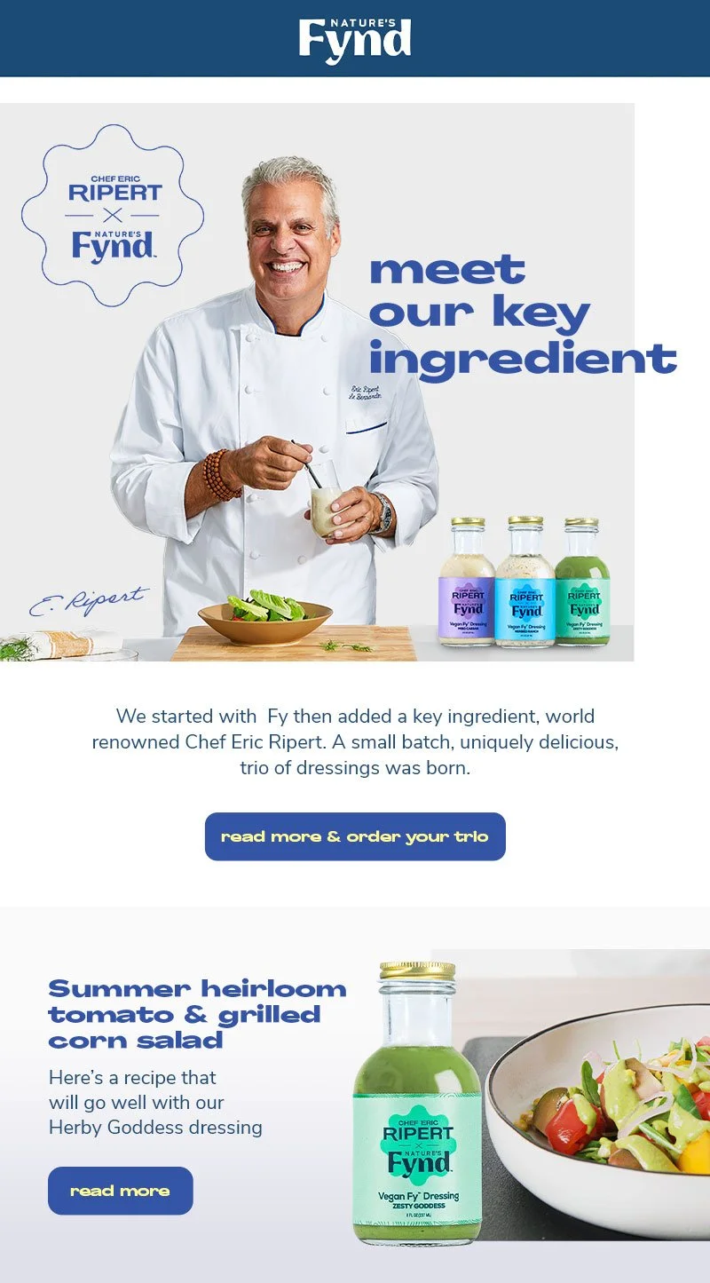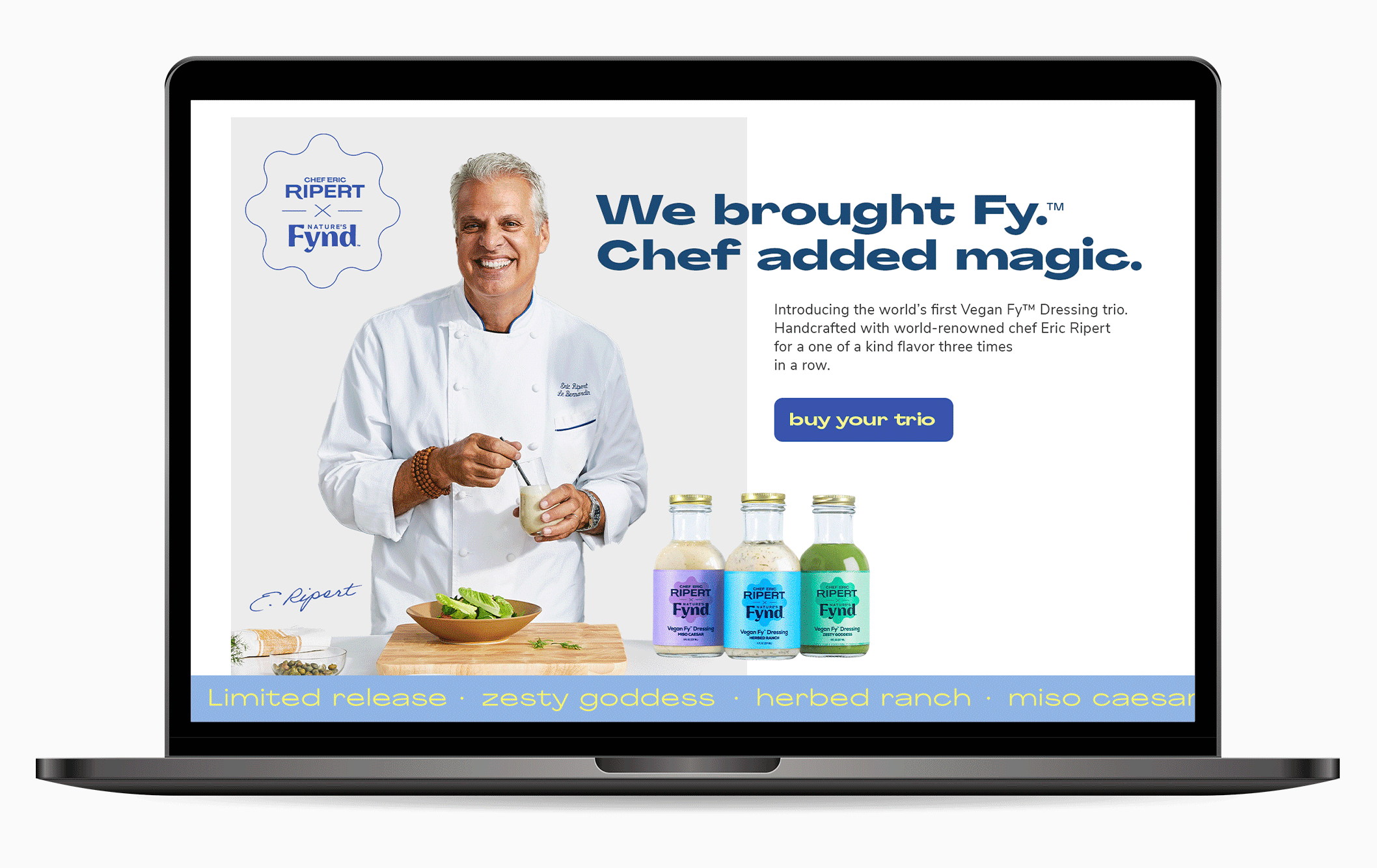 Worked with Nature’s Fynd to create concepts for the key visual, website, emails, and social media for their vegan salad dressing collaboration with Eric Ripert. Our goal was to create hype around this limited edition release in partnership with celebrity chef Eric Ripert, in hopes of selling out quickly to create more buzz for the brand. With a mix of social media ads, emails, influencers and PR placement, the collection sold out within a day!